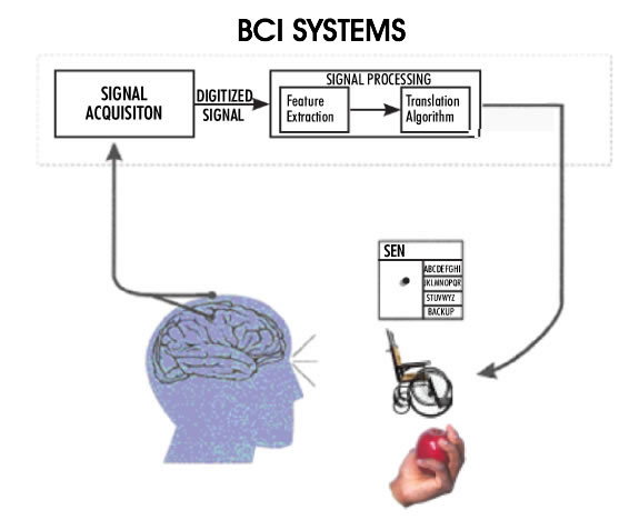 Both cochlear and retinal implants are sensory prostheses, i.e. aids for sensory impairments. Another family of neural prostheses deals with motor impairments. Severe motor disability results from high level spinal cord injuries (quadriplegia) where most of the body is paralyzed, sparing only some face, neck, and shoulder muscles. Quadriplegic individuals are in extreme need of a means to control their environment; they need to be in control of their wheelchairs, bed, the room temperature, lights, TV, etc. Because of the level of paralysis it is impossible for them to generate any control signal, except perhaps by sipping or puffing on the end of a tube, which produces a very poor control signal. In the case of a 'locked-in syndrome' the condition of the patient is even more serious, with only some functions remaining in the facial muscles. The term 'brain-computer interface' has been coined to refer to attempts whereby the motor output of the brain is recorded and interpreted to generate the control signals needed by these patients (Figure 3,9). The ultimate objective of this research will be accomplished when the patients are able to control anything they need to control in their environment, including a computer. The brain-computer interfaces vary in the invasiveness of the approach. The least invasive methods utilize the electroencephalogram (EEG) signals recorded from the scalp. Unfortunately, the signal quality is poor and only 'on/off' type of command signals can be generated using this method. In the most invasive, yet most successful applications, an array of electrodes is implanted directly into the motor cortex of the brain at a depth of a couple of millimeters. The recorded signals contain volitional information as the patient makes intentions to move their arms or legs. These signals can be controlled by the patient, and they can in turn be used to control their environment. The current level of success in this type of BCI allows the user to have three dimensional control of a robot arm. This is of invaluable benefit to a quadriplegic individual.