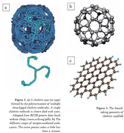The conformation of the plasma membrane changes substantially during endocytosis. Given that the cell membrane has a fluidic nature, it must be accompanied by a firmer construction in order to perform these structural modifications. In the case of receptor mediated endocytosis, this function is carried out by clathrin cages (or clathrin coats), which are formed adjacent to the membrane. The clathrin protein is a three-legged molecule which can freely diffuse inside the cell. However, when a ligand molecule binds to a receptor on the membrane then multiple clathrins aggregate into that region and polymerize into cages composed of pentagons and hexagons (Figure 2a). These cages surround the cell membrane, compelling it to engulf the cargo (ligand) by invagination. When the cargo is entirely enclosed by the membrane a scission protein seals off the enclosed cargo from the plasma membrane (Figure 2b). The completely internalized membrane pouch rapidly casts away its clathrin coat with a quick uncoating reaction. After this point, the membrane pouch, including the cargo, can be transported to the inner compartments of the cell. In living cells, this process takes a little less than a minute. Even though the lifetimes of the clathrin coats are not very long, scientists have found ways of ascertaining the detailed organization of these molecules.