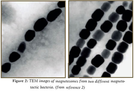 To understand how magnetotactic bacteria feel the magnetic field, it would be useful to check one’s transmission electron micrograph (Figure 1). The chain of magnetite (iron oxide) crystals forming a specialized organelle, called magnetesome, can be seen easily. The length of the whole chain is around one micron and each small crystal is around 50-60 nanometers. Each small crystal can be considered as a small magnet. These small magnets are aligned in a way that they support each other and the chain becomes a strong magnet. A lipid bilayer membrane surrounds this chain and holds them together. Forming chains on a straight line is not an expected behavior for small magnetite crystals. If they are produced synthetically, they accumulate together to form an aggregate. The pathways of chain formation in magnetesome are still an open question.