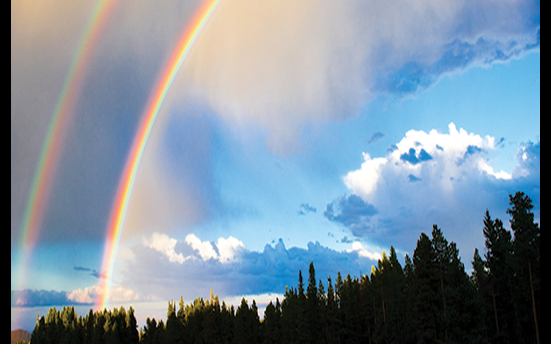 Image 3: Double rainbow. The primary red bow is on the outside, and blue is on the inside. Alexander’s dark band can be seen in between the two bows. It shows up really dark. For the secondary bow, red is on the inside, and blue is on the outside.