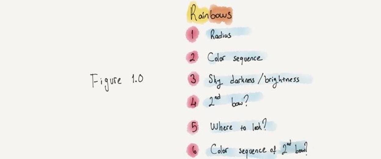 There are four fundamental facets we need to cover to understand a rainbow (Figure 1.0). The first is the “radius” of a rainbow. Since every rainbow has a radius, this means a rainbow is a circle. And every circle has a center point. A rainbow’s center point is below the horizon. Here, we can ask these follow-up questions: