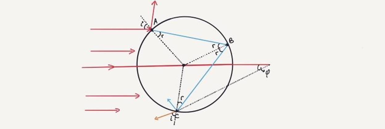 By the way, if we take the narrow beam which passes through the center of the raindrop, we can easily see that the angle of incidence is zero. In accordance to Snell’s law, this narrow beam goes straight through. Then it reflects back and finally it comes out of the water. This is true because: