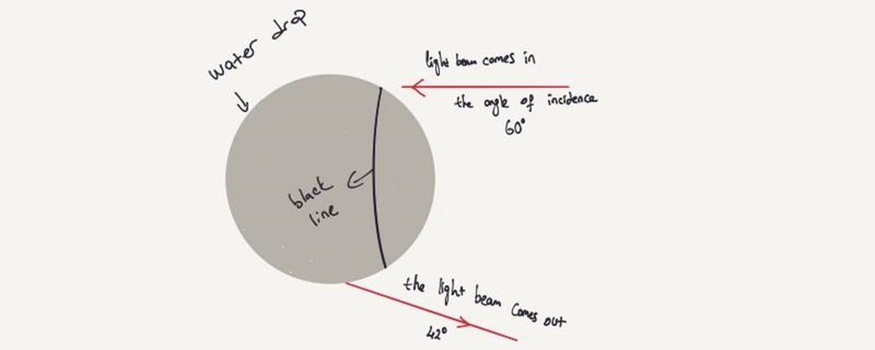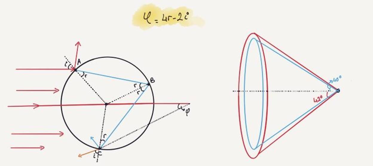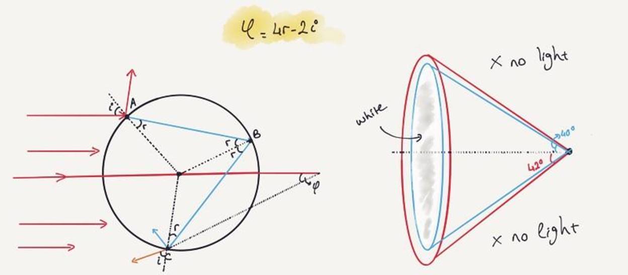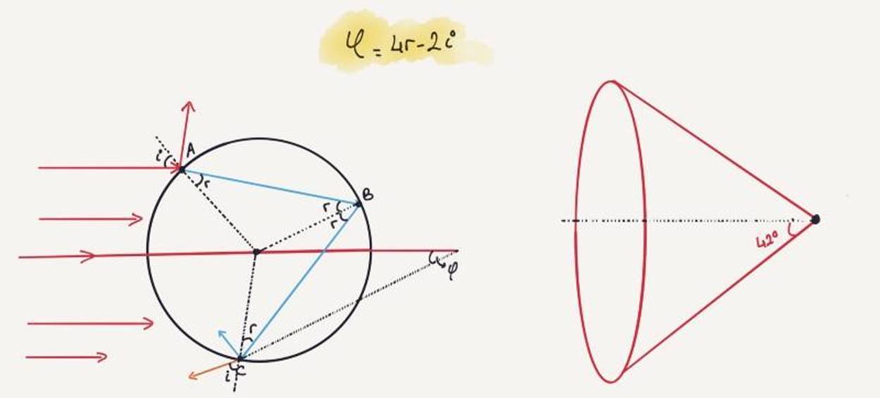 Figure 9.0 shows a representation of a water drop. The light that comes in at the angle of incidence is 60°. It refracts and reflects inside the droplet, then goes to point C and comes out of droplet at an angle of 42°. And, surprisingly, if the angle of incidence is 60°, when the light beam comes out, it has to be red light. On the other hand, there is not only one light beam coming in with an angle 60°. The entire surface of this water drop is illuminated by the sun, so there are an enormous number of beams for which the angle of incidence is 60°.