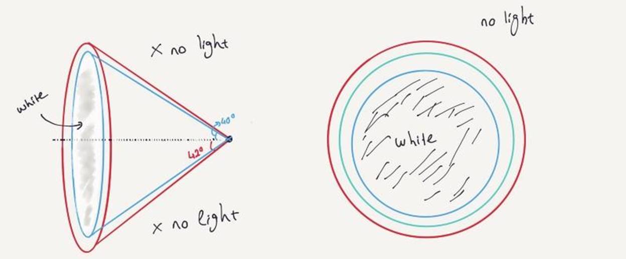 Light beams will come out of this drop, and that cone will be filled with red light. But the angle for the light beams cannot be larger than 42°, meaning they can be smaller. Then we will see a cone of lights.