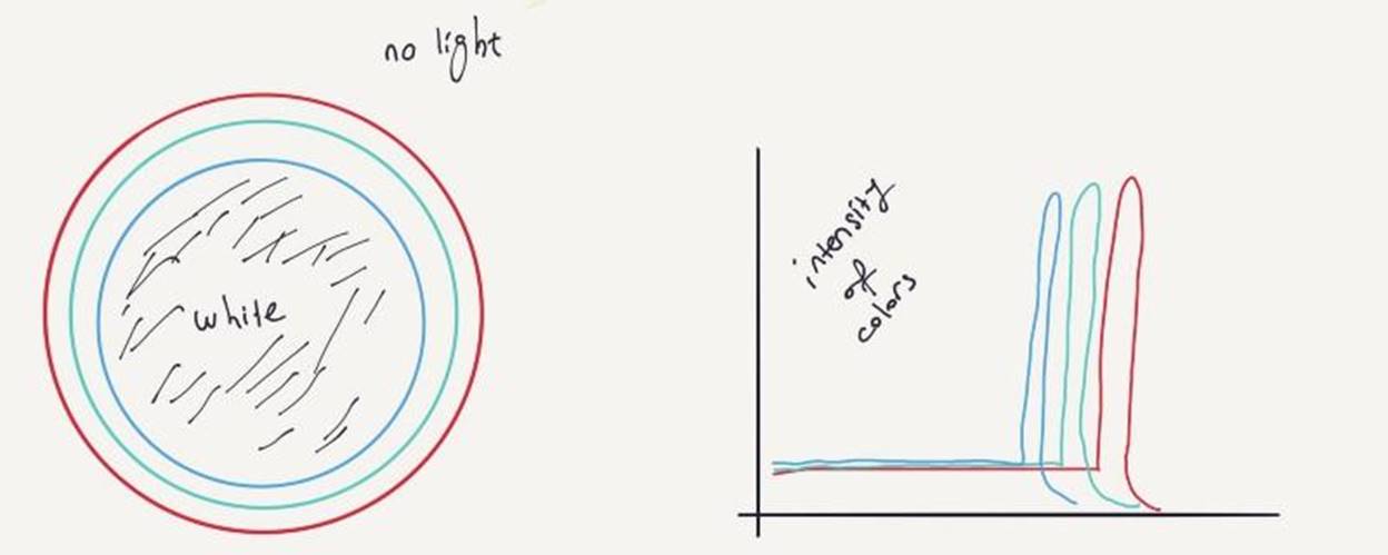 And now, we know where we will see red light, blue light, or white light. And we also know which direction has no light.