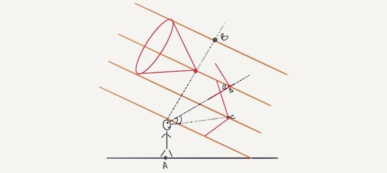 Let’s say you are standing at point A and the sunlight is coming from the left. Since the light comes from infinitely far away, all these lines are parallel to each other. Let’s say you look at the sky in direction B and pick a raindrop at any point. Any point you pick will cast the cone in the direction of the sun with the angle 60°.
