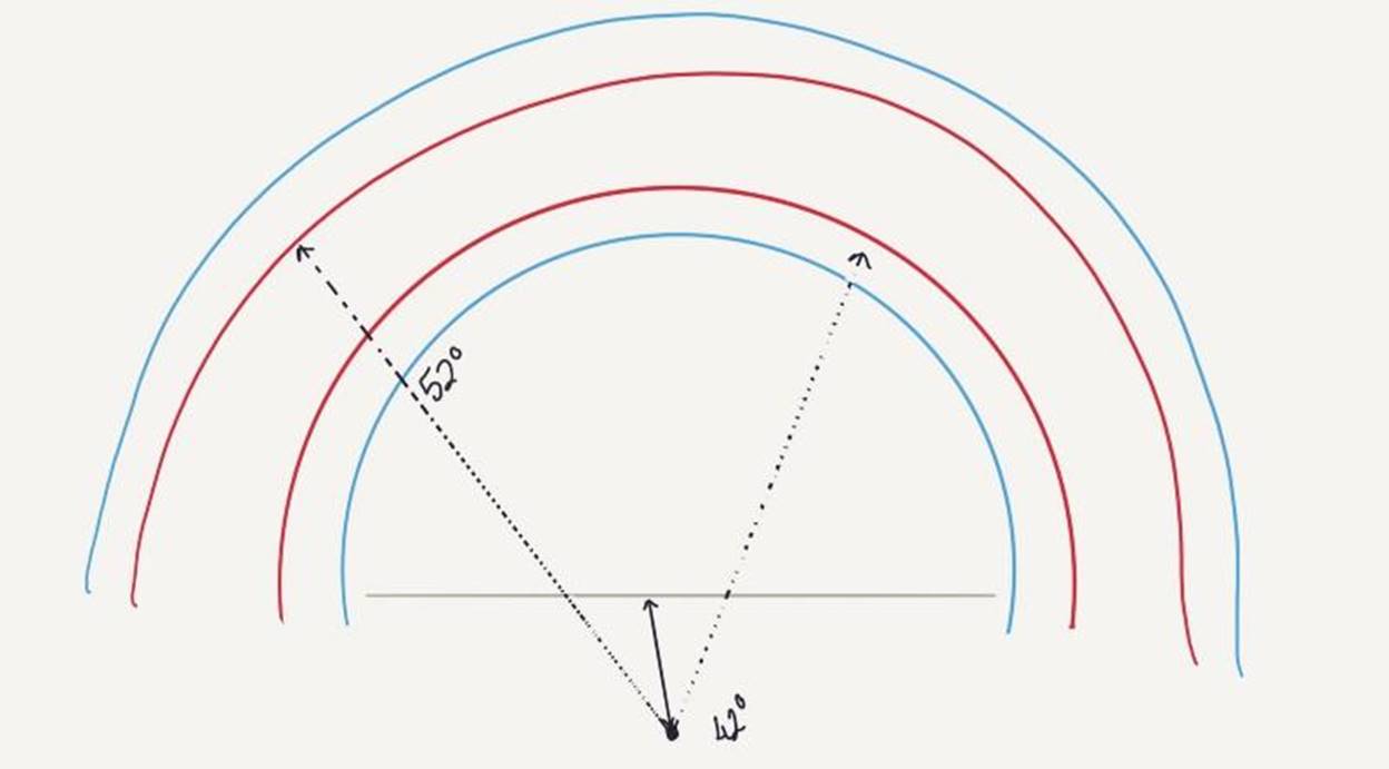 And if we do some calculation for the angles, we will see something very similar. We will find out that the second bow is pointing at the sky, and the angle is 10° above the first one (which is 52°). And, surprisingly, the colors of the second bowl reverse. In other words, red is the one on the inside, and blue is on the outside this time.