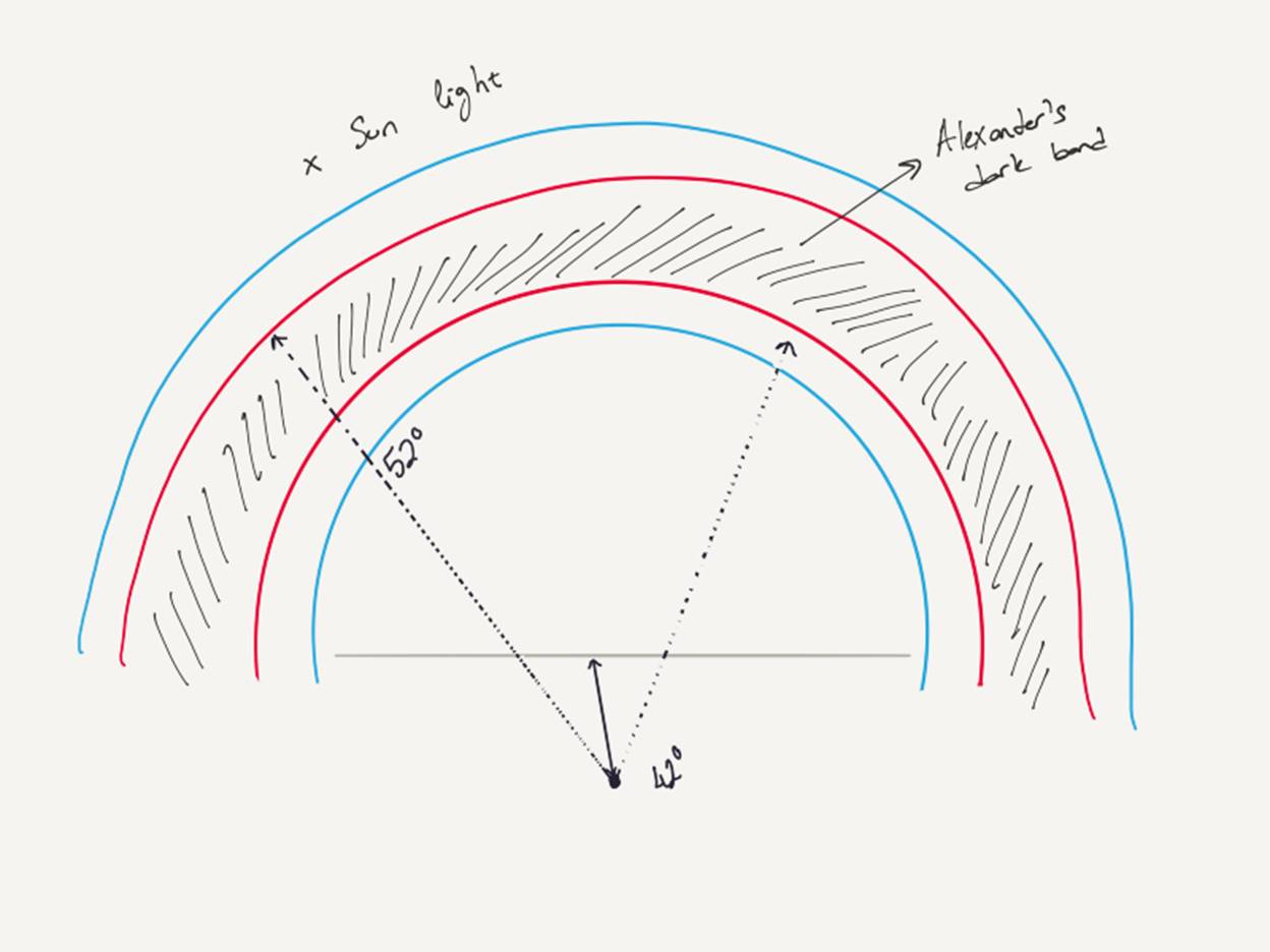 Interesting fact: There is no light between the two bowls. This is because of the φ maximum and minimum. We call that dark part Alexander’s dark band.[6]Additionally, since the second bowl is formed by φ minimum, sunlight can come out at angle φ or larger and there will be sunlight above a rainbow.