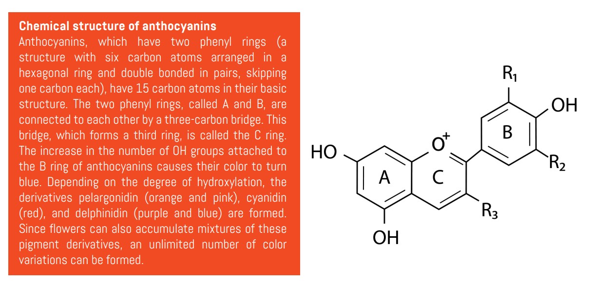 Anthocyanins absorb visible light with wavelengths between 400-800 nm, and the reflected part is seen as color. There are over 600 anthocyanins known today. Flowers can also accumulate a mixture of anthocyanin types, resulting in numerous color variations. Thus, these pigments function as masterpieces of art in hundreds of thousands of different shades of red, blue, and purple.
